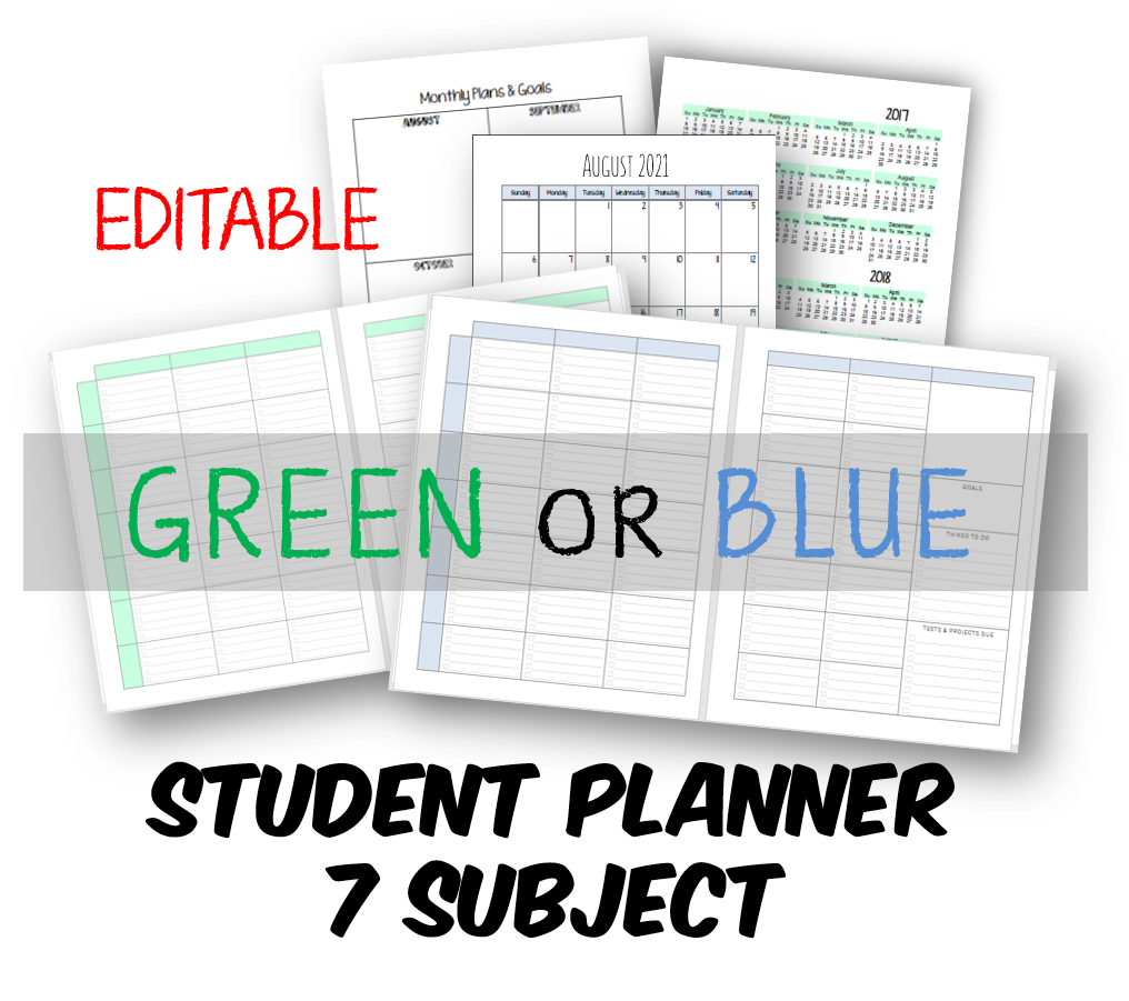 2023 2025 Student Planner 7 Subject Green or Blue EDITABLE